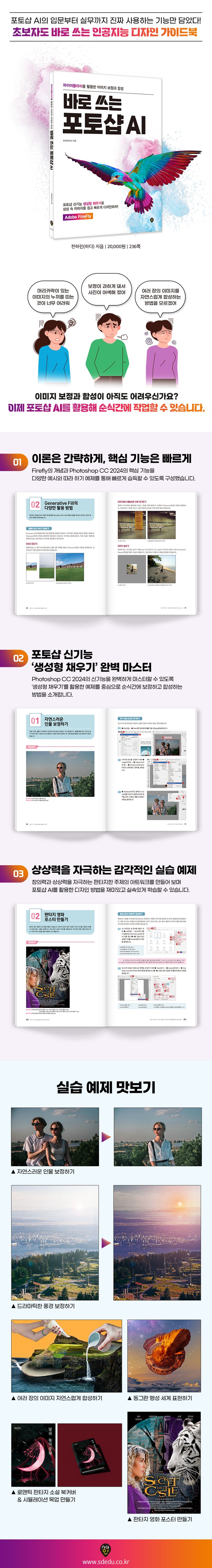 현직 디자이너인 저자가 ‘실무에서 진짜 사용하는 기능’만을 담았으며, 기존의 그래픽 매뉴얼 도서와 다르게 지루할 수 있는 메뉴 설명보다 예제를 중심으로 책을 구성하였다. 콜라주 배경화면 만들기, 로맨틱 판타지 소설 북커버 만들기, 판타지 영화 포스터 만들기 등 상상력을 자극하는 다양한 주제의 예제를 따라 하며 새로워진 포토샵의 핵심 기능을 학습할 수 있다.