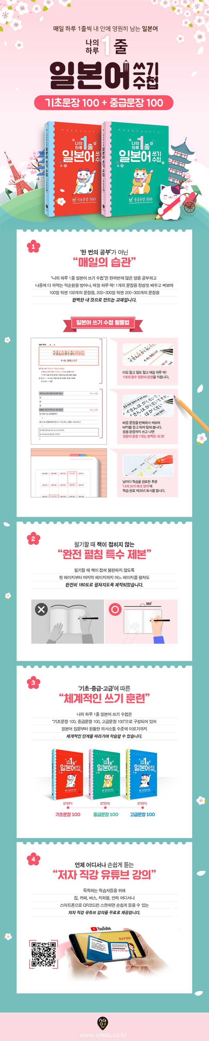 한꺼번에 많은 양의 일본어 단어/문법을 공부하고 나중에 다 까먹는 악순환을 벗어나, 매일 하루 1개의 일본어 핵심 문장을 써보며 100일 뒤엔 100개의 일본어 문장을, 200~300일 뒤엔 200~300개의 일본어 문장을 완벽한 내 것으로 만드는 교재입니다. ‘생활의 달인’이란 프로그램에서 달인들이 달인이 될 수 있었던 것은 습득한 기술을 오랜 시간 끊임없이 반복했기 때문입니다. 일본어 또한 한 번 공부하고 마는 것이 아닌, 매일 하루 1문장씩 끊임없이 써보고 반복하다 보면 어느새 일본어의 달인이 되어 있는 자신의 모습을 발견하게 될 것입니다.