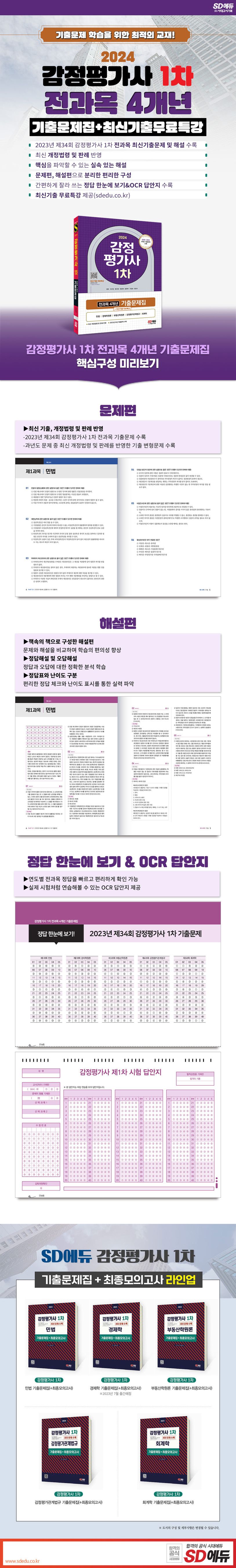 2023년 제34회 감정평가사 1차 전과목 최신기출문제 및 해설을 수록, 최신 개정법령 및 판례를 반영하였다. 문제의 핵심을 파악할 수 있도록 실속 있는 해설을 수록하였으며 편리하게 비교하며 학습할 수 있도록 문제편과 해설편을 분리하여 구성하였다. 간편하게 잘라 쓸 수 있는 정답 한눈에 보기 & OCR 답안지를 수록하였고 최신기출 무료특강을 제공한다(sdedu.co.kr).