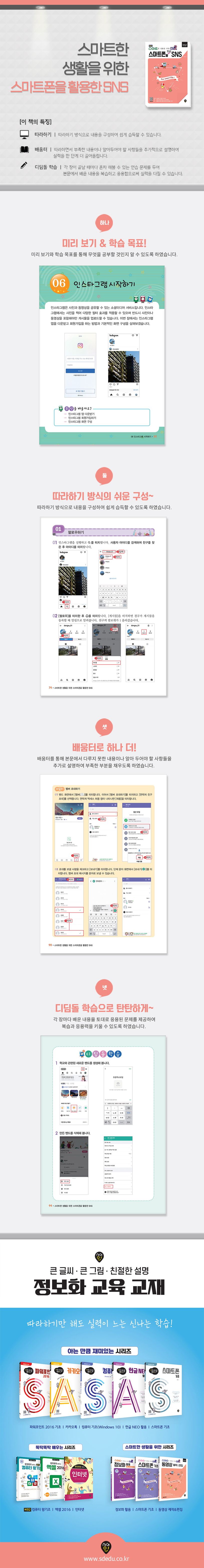 『스마트폰을 활용한 SNS』는 큰 글자체와 따라하기 방식으로 구성되어 누구나 쉽게 배울 수 있도록 구성한 정보화교육 기본 활용서다. 스마트폰으로 SNS를 효율적으로 사용할 수 있도록 내용을 구성하였으며, 활용 예제를 따라하는 방식으로 한 단계씩 익힐 수 있도록 했다. [배움터]를 통해 부족한 설명 및 문제 해결 방법을 제공하고 있어 실력을 한층 더 업그레이드할 수 있으며, [디딤돌 학습]을 통해 학습 내용을 얼마나 이해했는지를 점검할 수 있다.