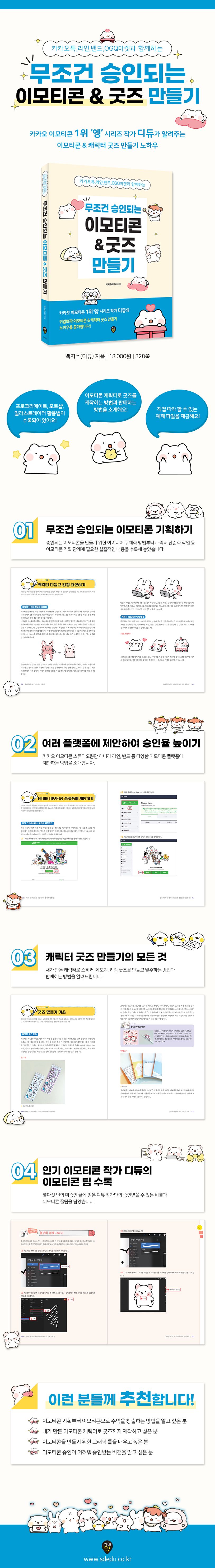 카카오 이모티콘 전체 1위를 차지한 ‘엥’ 시리즈, ‘쮸구리는 당당해!’, ‘쬬쬬랑 놀아줘라!’, ‘꽁쭈의 말을 듣거라!’ 등 통통 튀는 발랄함으로 이모티콘 출시작마다 화제를 불러일으키는 디듀 작가의 이모티콘 & 굿즈 만들기 노하우를 꾹꾹 눌러 담았다. 이모티콘을 기획하는 방법부터 카카오 이모티콘 스튜디오 외에 네이버 밴드, 라인 등 플랫폼별 제안 방법까지 이모티콘의 A to Z를 완벽하게 알려주며 나아가 굿즈 스토어를 운영하는 저자의 경험을 녹여 캐릭터 굿즈 제작과 수익 창출 방법도 시원하게 소개한다.