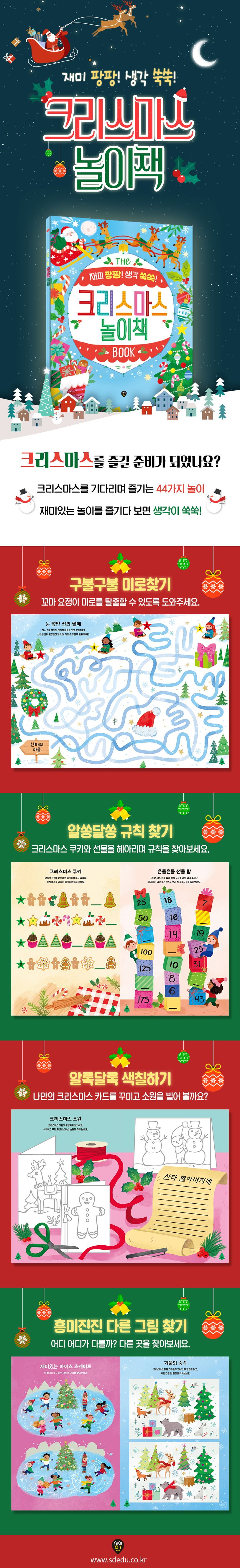 크리스마스 아이템들이 등장하는 미로 찾기, 점 잇기, 계산하기, 기억력 게임 등으로 재미 팡팡! 생각 쑥쑥!