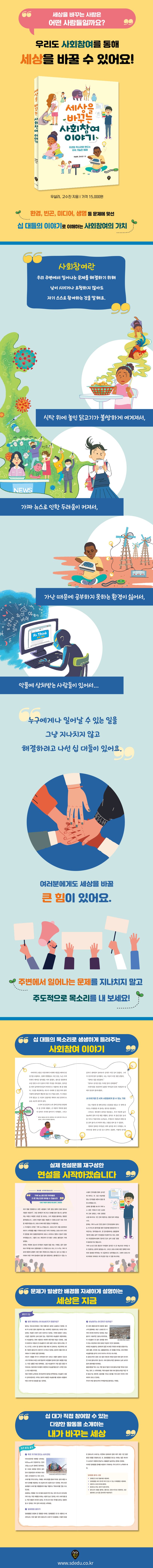 사회참여를 통해 십 대도 세상을 바꿀 수 있다. 사회참여란 우리 주변에서 일어나는 문제를 해결하기 위해 남이 시키거나 요청하지 않아도 스스로 참여하는 것이다. 십 대는 단순히 나이가 어리고 평범한 학생이 아닌 미래 사회를 이끌어갈 아주 중요한 시민이기 때문이다.