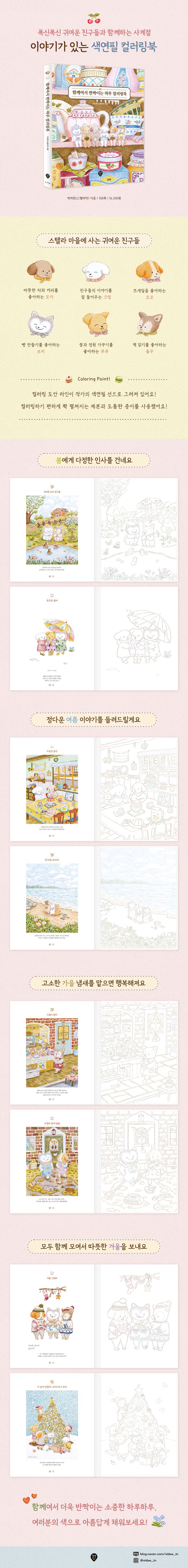유난히 반짝이는 별이 뜨는 스텔라 마을에는 모카, 크림, 코코, 보리, 루루, 율무라는 사이좋은 여섯 친구가 살고 있어요. 이 귀여운 강아지들은 한 집에 모여 살며 차와 커피를 마시고, 빵을 구워 나눠 먹고, 정원을 가꾸며 행복한 하루하루를 보내고 있어요. 사계절의 이야기를 예쁘게 하나하나 칠하다 보면 어느새 이 귀여운 친구들의 매력에 푹 빠지게 될 거예요.