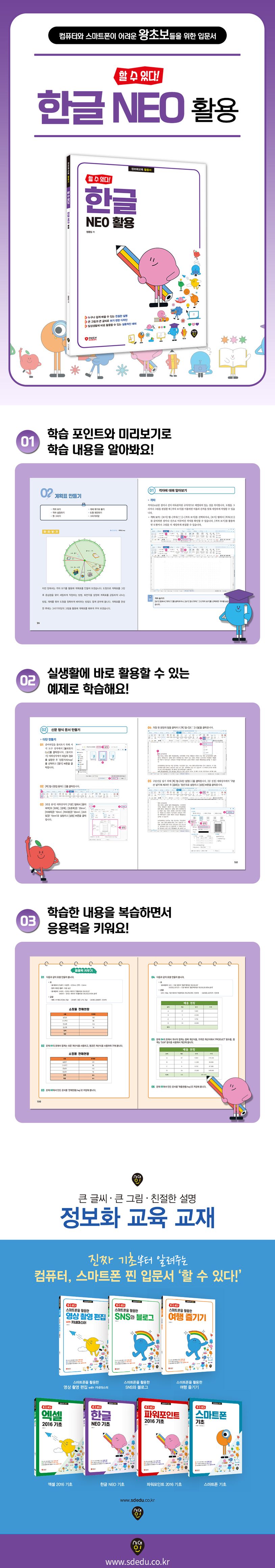 이 책은 한글 NEO 활용서로 한글 문서 작업의 활용 범위를 넓혀줄 수 있는 도서입니다. 한글 프로그램의 화면 구성이나 텍스트 입력 방법과 같은 기본적인 내용부터 특수 문자 삽입하기, 글상자 꾸미기 등 문서 작업에 활용할 수 있는 다양한 기능을 학습합니다. 또한 계획표 만들기, 음악 편지 만들기, 가계부 만들기 등 실생활에서 활용할 수 있는 문서를 따라 하기 예제를 통해 만들어 볼 수 있습니다.