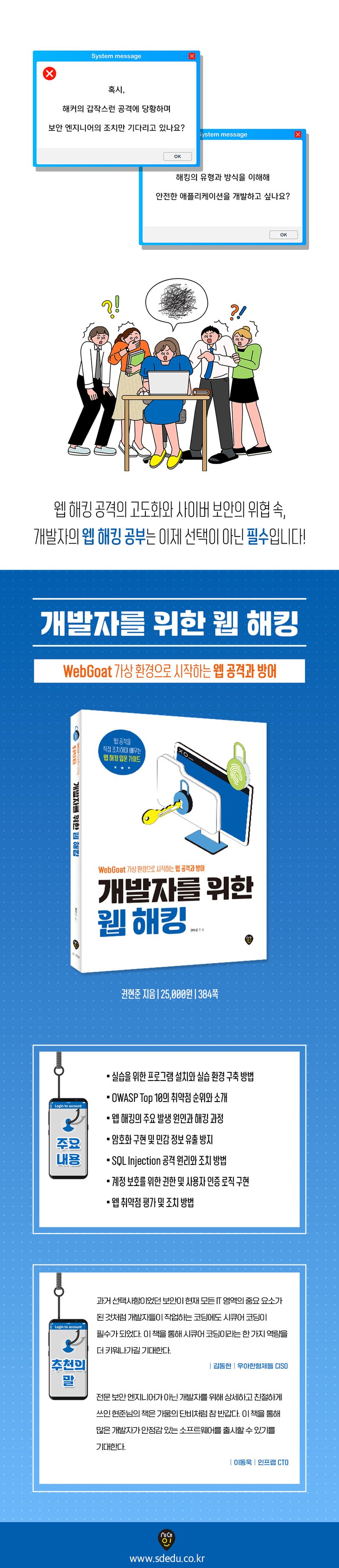 이 책은 개발자의 시간을 조금이라도 아끼기 위해 해킹과 관련한 방대한 지식을 모두 학습하기보다는 웹에 자주 발생해 보안상 큰 영향을 주는 웹 해킹의 주요 취약점 10가지(OWASP Top 10)를 살펴보고 WebGoat 실습문제로 모의 해킹을 진행해 웹 해킹의 공격 방법과 원리에 대해 빠르게 익힐 수 있습니다.
