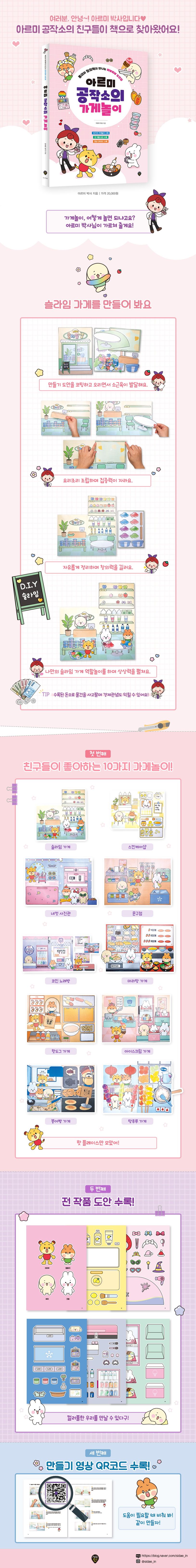 도안을 코팅하고, 오리고, 조립하기만 하면 몇 번이든 가지고 놀 수 있는 띠부띠부 가게놀이가 완성됩니다. 튜토리얼의 QR코드를 찍으면 아르미 공작소에서 만들기 영상을 직접 확인할 수도 있어요.