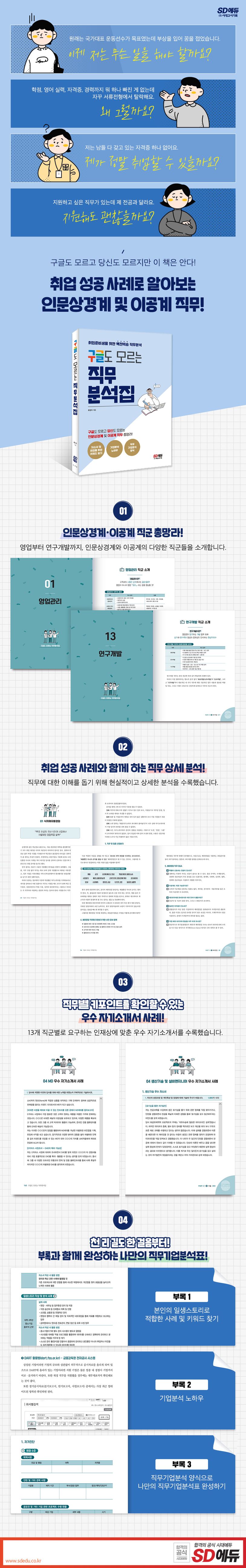 PART 1에서는 영업관리, 마케팅, 경영지원, 금융권 등 인문상경계 관련 직무를, PART 2에서는 품질, 기술 등 이공계 관련 직무를 상세히 수록하였으며, 부록에서는 본인과 적합한 사례 및 키워드 찾기, 기업분석 노하우, 직무기업분석 양식 등을 제공해 독자 여러분들의 취업준비에 도움이 될 수 있도록 했다.