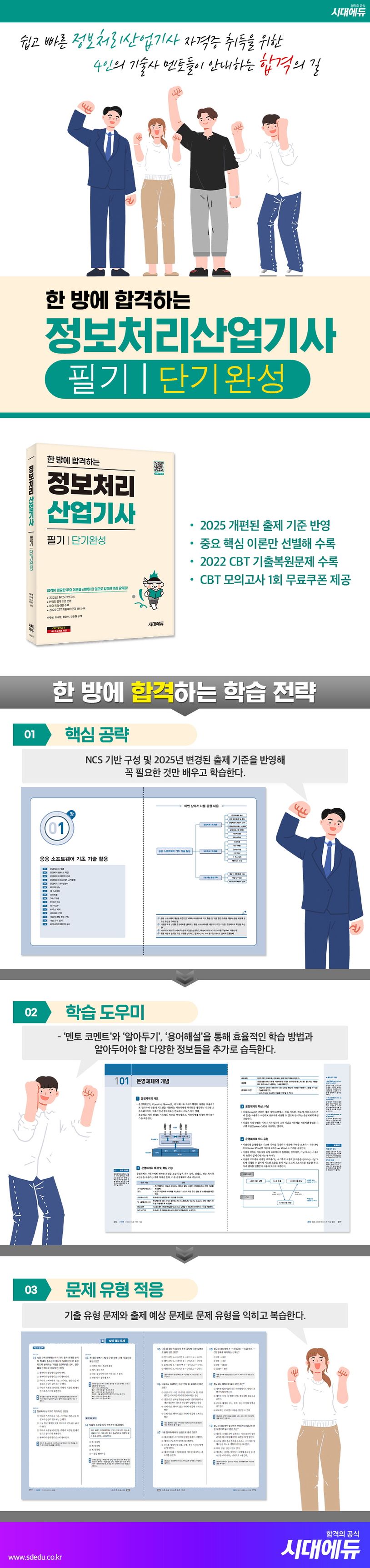 정보처리산업기사 필기시험을 대비해 NCS 기반 구성 및 2025년 개편된 출제 기준을 완벽히 반영하였고, 정보처리 분야 최고의 멘토들이 다년간 출제 경향을 분석해 시험에 자주 출제되는 핵심 이론만 압축 정리했다.