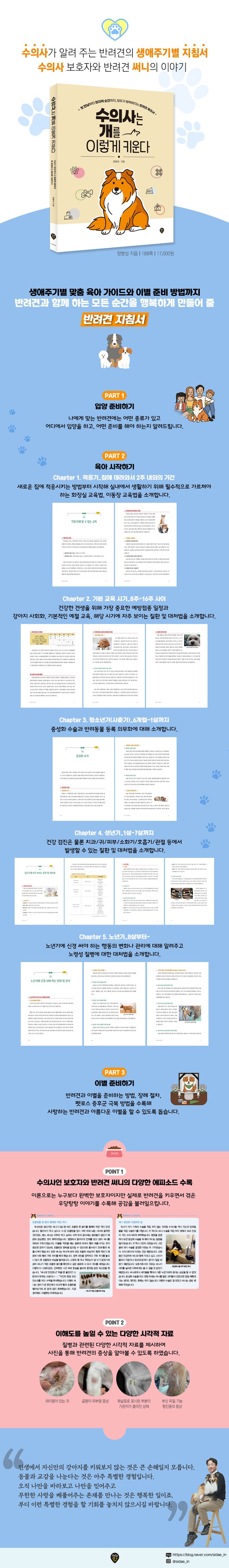 저자는 동물과의 교감이 주는 충만함이 무엇인지, 늘 같은 자리에서 변함없이 나를 바라봐 주고 지지해 주는 존재가 있다는 것이 어떤 것인지 많은 사람이 느끼길 바라고 있습니다. 『수의사는 개를 이렇게 키운다』를 통해 여러분도 이런 특별한 경험을 할 기회를 놓치지 않으시길 바랍니다.