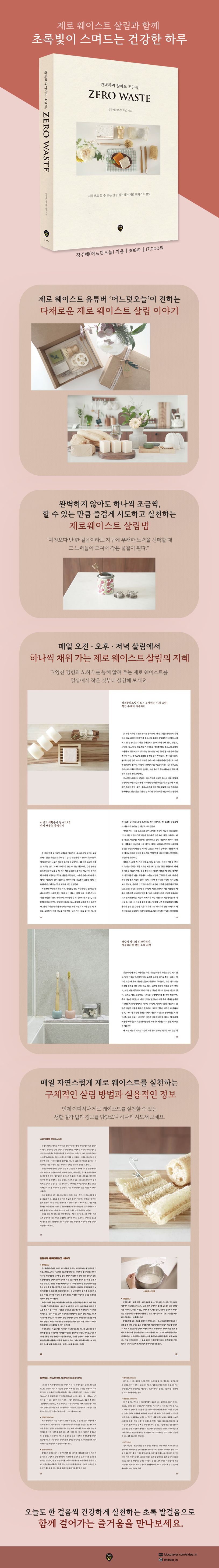 『완벽하지 않아도 조금씩, 제로 웨이스트 : 서툴러도 할 수 있는 만큼 실천하는 제로 웨이스트 살림』은 일상에서 쉽고 즐겁게 시도할 수 있는 건강한 제로 웨이스트 살림법을 알려 주는 책입니다. 제로 웨이스트 살림 유튜버인 ‘어느덧오늘’ 저자는 완벽하지 않아도 조금씩 제로 웨이스트를 시도하고 실천하는 것이 중요하다고 이야기하며, 자신의 실제 경험과 노하우를 통해 집 안과 밖에서 매일 하나씩 실천할 수 있는 제로 웨이스트 살림법을 소개합니다.