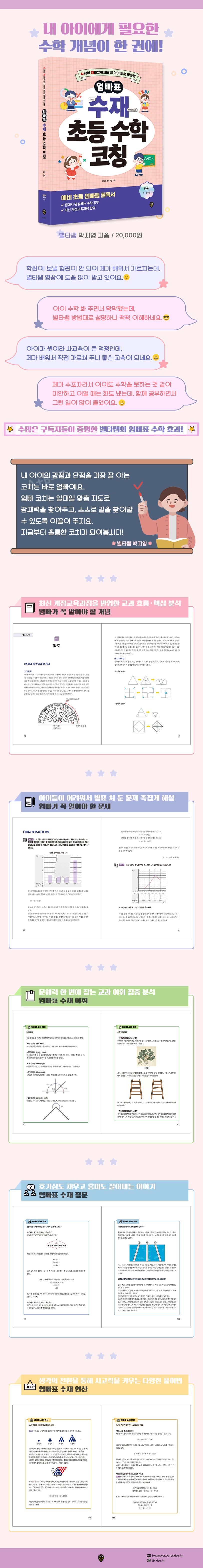 『엄빠표 수재 초등 수학 코칭 하권』은 유튜브 누적 조회 수 수십만을 기록한, 부모를 위한 수학 멘토 박지영(별타쌤) 저자의 두 번째 책이다. 하권은 초등 4~6학년 교과 과정을 담았으며, 수학 멘토이자 두 아이의 어머니로서의 경험을 바탕으로 아이들이 어려워하는 부분은 물론, 부모들이 설명하기 까다로운 지점까지 빈틈없이 짚는다. 기본 개념, 어휘, 질문, 연산, 어려운 응용문제까지 단계적으로 이해를 돕는 풍부한 팁과 지도법을 소개한다.