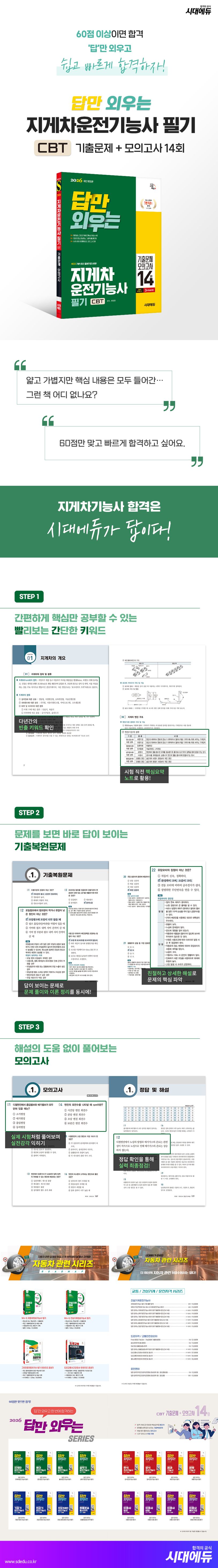 사시험은만점을목표로하는시험이아니라평균60점이상을받아합격하는것에의의가있습니다.그래서시험에꼭나오는부분만중점적으로공부할수있도록제시하는것이합리적이고계획적인수험서가갖추어야할조건이라고할수있습니다.“답만외우는지게차운전기능사필기CBT기출문제+모의고사14회”는정답이한눈에보이는기출복원문제7회분과해설없이풀어보는모의고사7회분으로구성하여필기시험을준비하는데부족함이없도록하였습니다.또한핵심요약집빨간키를통해시험에완벽하게대비할수있습니다.