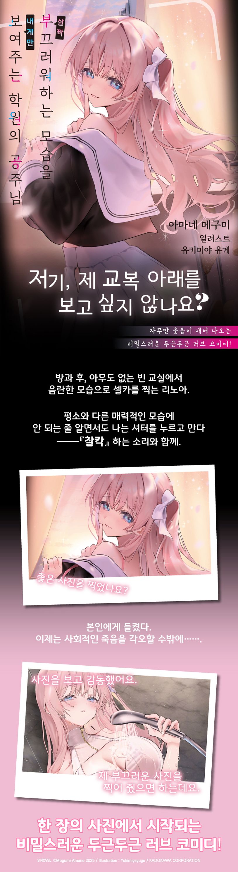 방과 후, 아무도 없는 빈 교실. 교복이 벌어진 음란한 모습으로 셀카를 찍고 있는 사람은 청초하고 가련한 ‘학원의 공주님’ 시노미야 리노아였다. 평소 모습과는 다른 매력적인 모습에 이러면 안 되는 줄 알면서도 나는 셔터를 누르고 만다── 찰칵. “안노, 좋은 사진을 찍었나요?” 본인에게 들켰다. 이건 사회적인 죽음을 각오할 수밖에……. “……제 부끄러운 모습을 사진으로 찍어 줄래요?” “……뭐라고?” 왜 이렇게 됐는지는 모르겠지만, 리노아와 비밀 촬영회를 하게 되는데?! 내 방에서는 교복 갈아입기, 욕실에서 경영 수영복, 그리고 그녀의 집에서──. 한 장의 사진에서 시작되는 비밀스러운 두근두근 러브 코미디 개막!