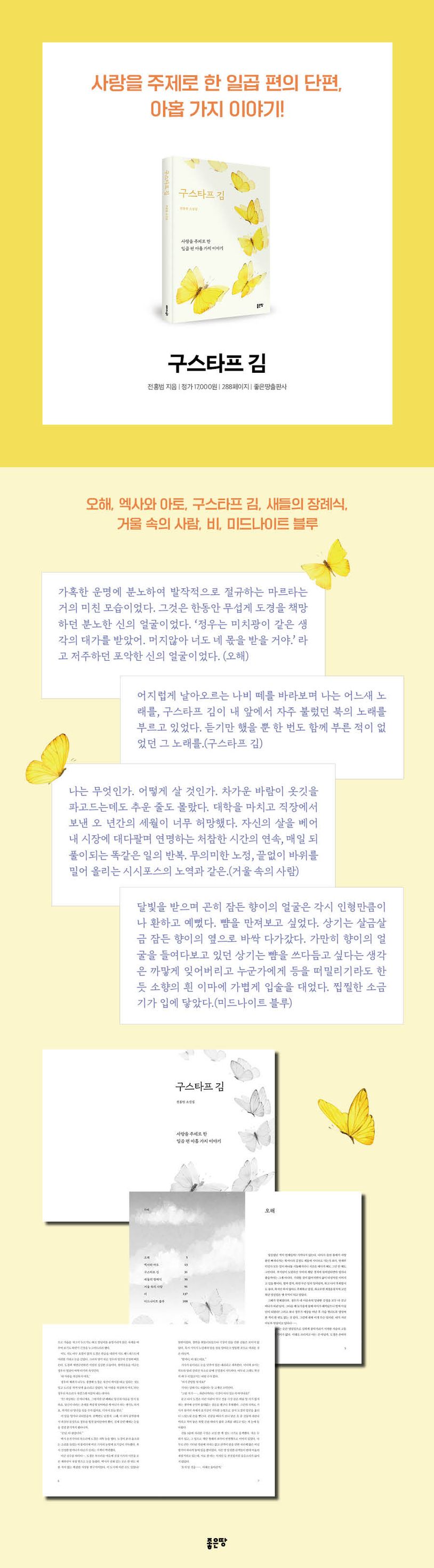 이번에출간한소설집은소설작가로서의등단작이자표제작인「구스타프김」을비롯하여사랑을주제로한일곱편의중·단편소설「오해」,「엑사와아토」,「새들의장례식」,「거울속의사람」,「비」,「미드나이트블루」를수록하고있다.짧은분량으로기억의파장을유려하게표현한「오해」,세가지이야기가교차하며방대한정서를표출하는중편소설「미드나이트블루」등이멋지다.