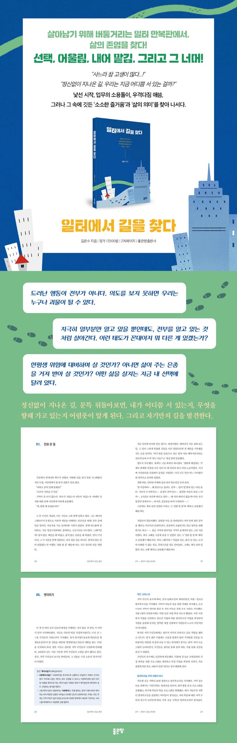 1부는 일터에서 첫발을 내디딘 후 의도하지 않게 펼쳐지는 다양한 상황 속에서 때로는 억지로 때로는 자연스럽게 마음을 맞추어 가는 과정을, 2부는 들어선 길에 익숙할 때쯤 찾아온 일터의 소용돌이 한가운데서, 건강한 조직, 건강한 리더, 직원의 전문적 역량의 필요성을 깨닫고, 어떻게든 한 단계 성장하고픈 몸부림으로 새롭게 펼쳤던 길을 풀어놓았으며, 마지막 3부는 지나온 길을 잠시 뒤돌아보며 자신이 어디쯤 서 있는지, 무엇을 향해 가고 있는지에 대한 자신의 정리된 생각을 담았다.