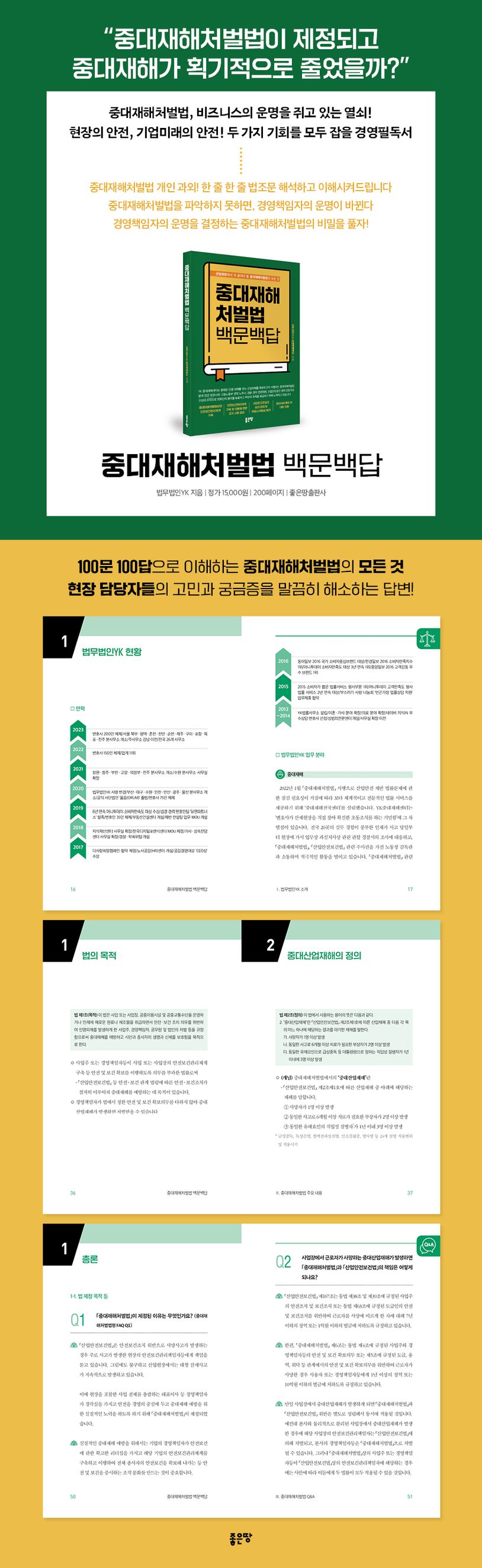 법무법인YK 중대재해센터는 산업현장에서 이 법을 보다 쉽게 이해하는 데 도움을 드리고자, 궁금해하는 질문과 답변 100여 건을 체계적으로 정리하여 책자를 발간하게 되었다. 아무쪼록 이 책을 통해 산업현장에서 법의 취지에 맞게 법이 이행됨으로써 중대재해가 획기적으로 줄어들 수 있기를 기대해 본다.