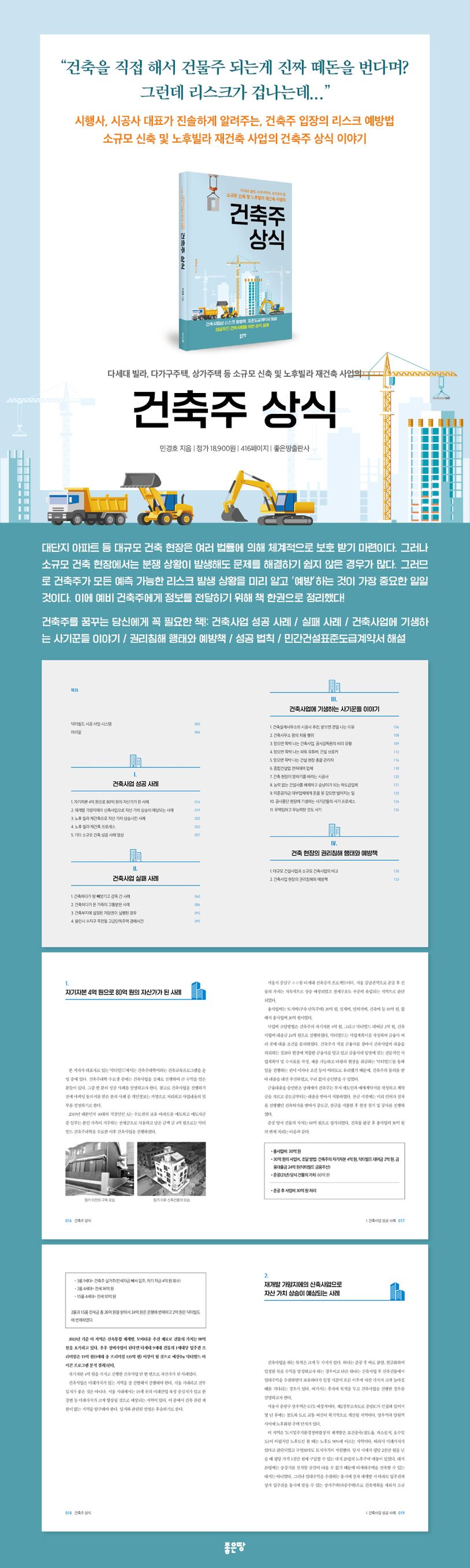 대규모 부동산 개발과는 달리, 소규모 건축사업에 참여하는 건축주들이 마주할 수 있는 리스크와 그에 대한 회피 방법에 대한 정보는 부족하다. 이에 저자는 건축주가 부정확한 사업성 검토나 무경험한 건축주의 결정에 의해 발생할 수 있는 다양한 문제점에 주목하여 이러한 문제에 대한 현상을 설명하고, 이를 피하기 위한 정보를 얻기가 어려운 현실을 진단한다.
