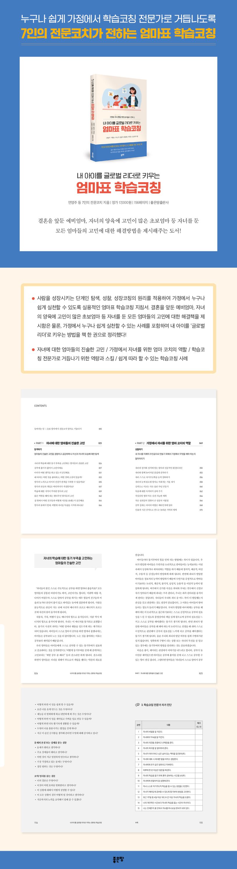 7인의 전문코치가 가정에서 엄마들이 할 수 있는 학습코칭 방법을 제시해 주는 자녀 교육 가이드북이다. 예비 엄마, 초보 엄마들의 고민을 나누며 아이를 코칭하는 다양한 방법과 사례들을 제시한다. 학습코칭은 탐색, 성찰, 성장, 그리고 실천의 단계로 이뤄져 있다. 이 여정을 통해 엄마들은 더 나은 학습 환경을 조성하고, 자녀의 잠재력을 최대한 발휘하며, 성공적인 학습 태도를 유도하는 데 필요한 도구와 지식을 얻을 수 있을 것이다.