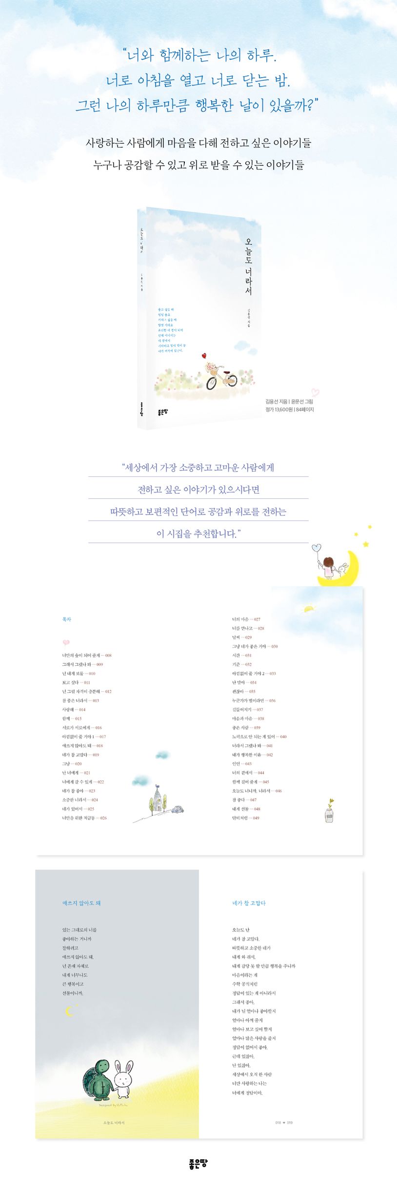 시집 『오늘도 너라서』는 귀에 속삭이는 여름의 바람처럼 힘들고 지친 일상에서의 잠깐 휴식 같은 시다. 마치 가장 자신의 존재를 잘 알아주는 친구가 바로 옆에서 손을 잡고 눈을 맞추며 이야기해 주는 듯한 따뜻함이 느껴진다. 누구나 공감할 수 있고 위로를 받을 수 있는 보편적인 단어의 미장센들을 보여 준다. 화자는 우리에게 말한다. “네 곁에서 기다리고 힘이 되어 줄 내가 여기에 있단다.”