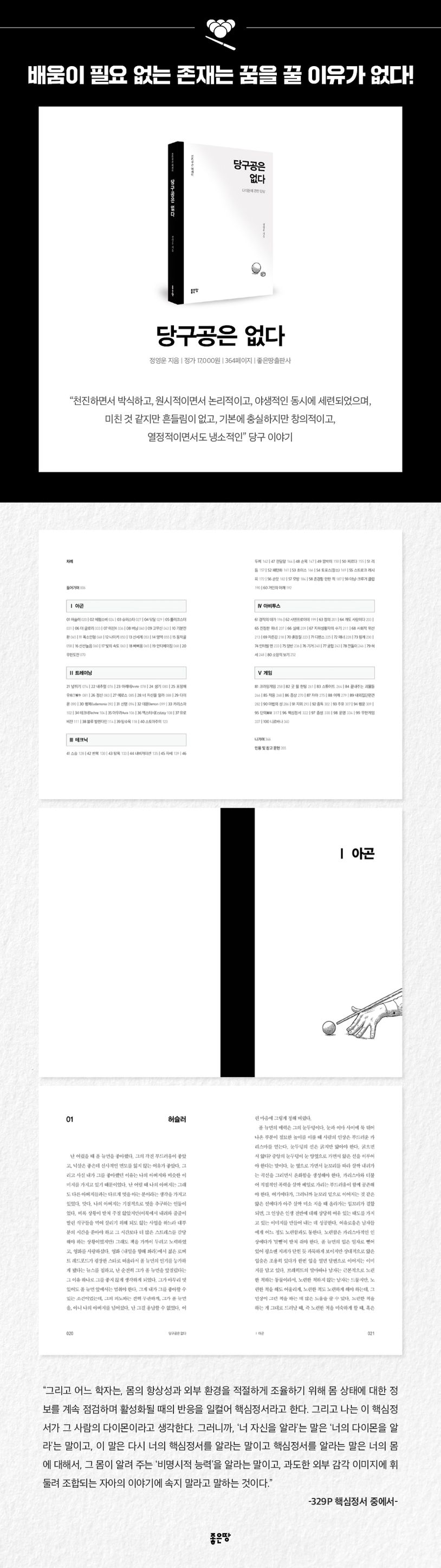 당구클럽 주인장의 쓰리쿠션 에세이. 당구를 전면에 내세우고 있지만 당구 기술을 가르치는 당구 교본은 아니다. 당구장에 모여드는 사람, 사람들 간의 상호작용 내지는 신경전, 이 모든 것들이 모여 작은 사회를 만든다. 여기서 당구는 단순히 공을 쳐서 점수를 내는 행위가 아니라, 인간의 내면과 사회적 관계를 조망하는 창구로서 기능한다. 즉, 인문학적 사유와 당구라는 놀이의 기묘한 공존 속에서 이야기가 전개된다.