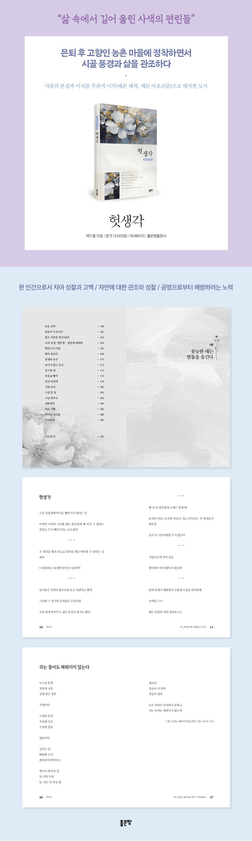 고향에 내려가 사는 소박한 삶, 인생무상, 연민 등 생활 속 성찰이 돋보이는 시집이다. 시의 화자는 스스로를 시골뜨기 촌놈이고 자신의 생각은 헛생각이라 낮추면서 자신의 감상 따위를 가볍게 읊는 듯하다. 하지만 시행 하나하나 뼈 없는 말이 없다. 시인이 허허로이 웃으며 농처럼 던지는 말은 술술 읽히다가 불현듯 뼈를 맞은 듯하다.
