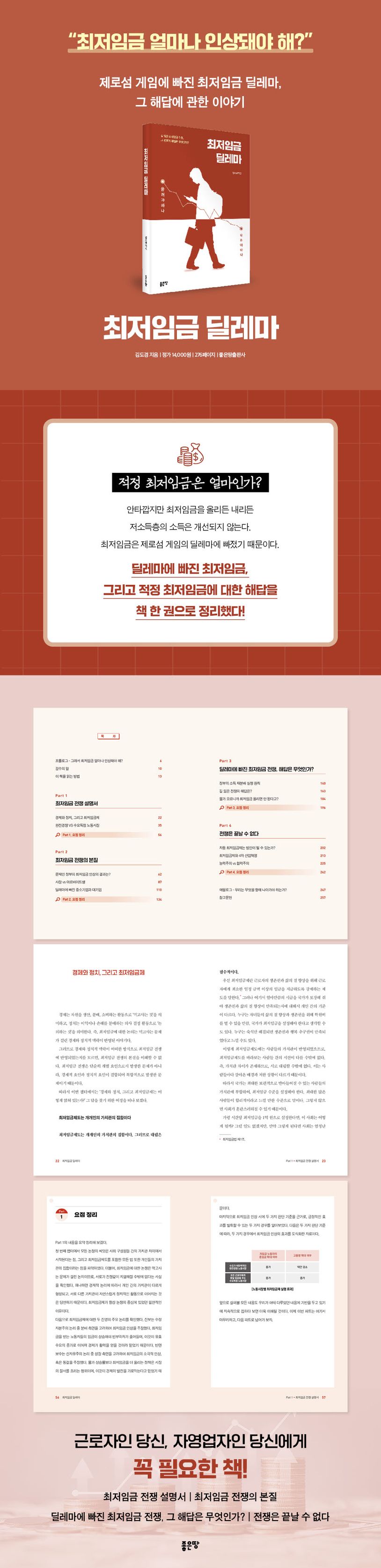 “그래서 최저임금 얼마나 인상돼야 해?”는 저자기 이 책을 집필하면서 가장 많이 들은 질문이다. 최저임금 인상 결과에 따라 근로자와 고용자는 서로를 향한 전쟁과도 같은 분노를 쏟아낸다. 저자 김도경은 최저임금 인상 혹은 인하의 효과를 분석하는 것에 그치지 않고, 최저임금 전쟁의 본질과 논의의 요점, 더불어 딜레마에 빠진 최저임금 전쟁에 대한 해답을 쉽게 파악할 수 있게 책을 구성했다. 이 책은 단순한 최저임금 전쟁 설명서를 넘어서, 거대한 흐름에서 최저임금과 경제의 뼈대를 이해할 수 있는 기회가 될 것이다.