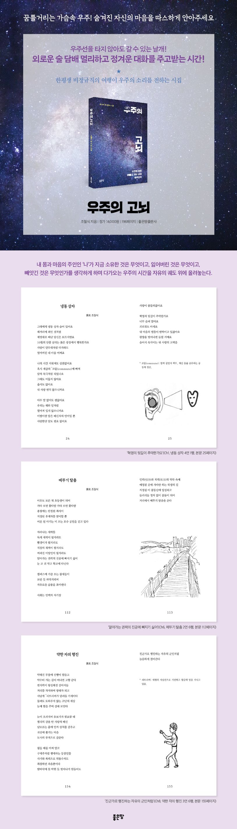 《우주의 고뇌》는 현대 사회를 깊이 있게 탐구하고 있다. 총 10개의 다채로운 챕터로 독자를 흥미진진한 ‘고뇌’의 세계로 초대한다. 조철식 시인만의 날카롭고 섬세한 시각으로 재현된 ‘우주’는 인세(人世)의 희로애락과 세태를 그려 낸다. 이러한 ‘고뇌’는 독자들로 하여금 당면한 현대 사회에 대한 새로운 시각을 열어 줄 것이다. 조철식 시인이 시집 위에 펼쳐낸 우주의 고뇌, 그 유려한 문장이 주는 울림을 따라가 보자.