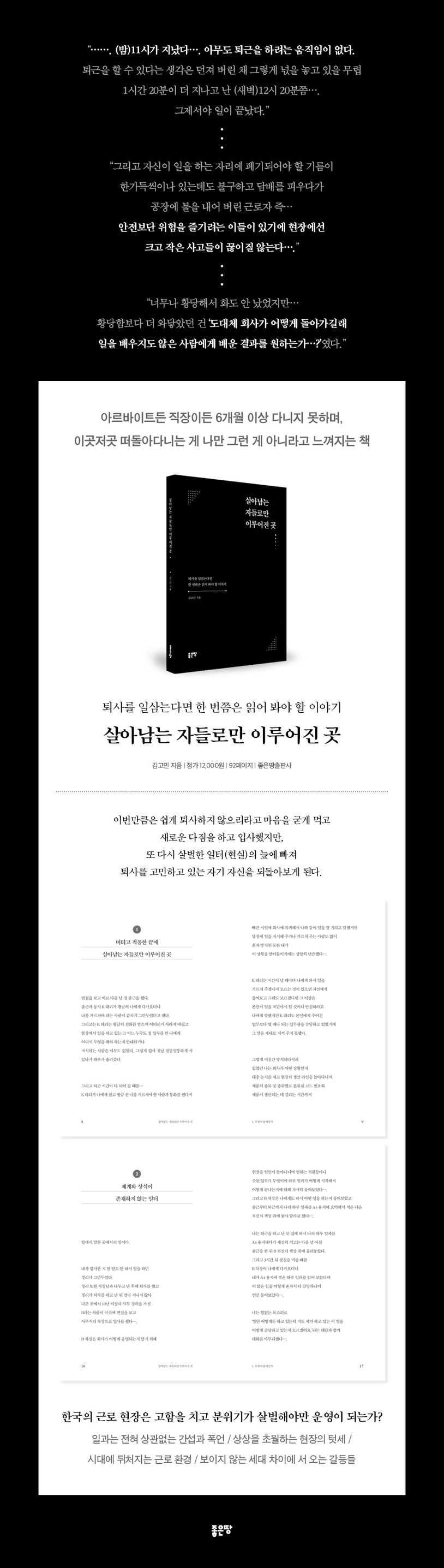 분명 면접 합격에 목매던 시절이 있었다. 하지만 그 열정 가득했던 사회초년생의 모습은 어디로 갔는가? 그 원인을 추적해 보고 싶다면, 《살아남는 자들로만 이루어진 곳》으로 함께 떠나 보자.