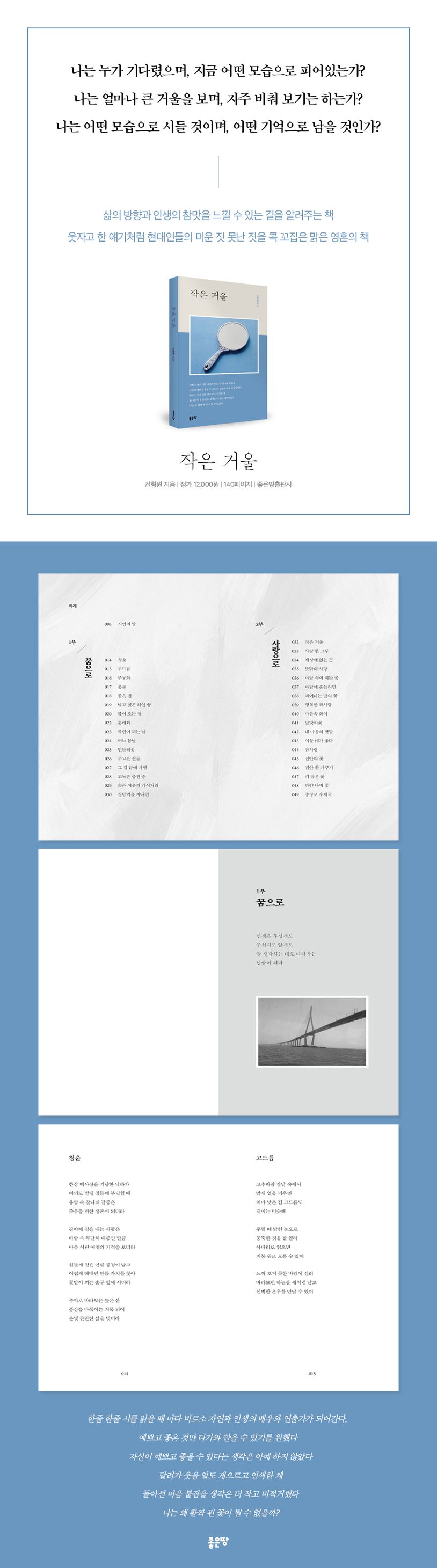 《점령군 미세먼지》, 《어머니는 냉장고다》에 이어 발간된 권형원 시인의 세 번째 시집이다. ‘꿈으로’, ‘사랑으로’, ‘믿음으로’, ‘열정으로’, ‘추억으로’ 세상을 바라보는 다섯 개의 챕터와, 권형원 시인만의 재치가 돋보이는 여섯 번째 챕터 ‘웃자고’로 구성돼 있다. 어떨 땐 사랑스럽다가, 어떨 땐 날카로운 시구로써 세계를 찔러낸다. 그가 바라본 세상, 시적(詩的) 세계 《작은 거울》을 들여다보자.