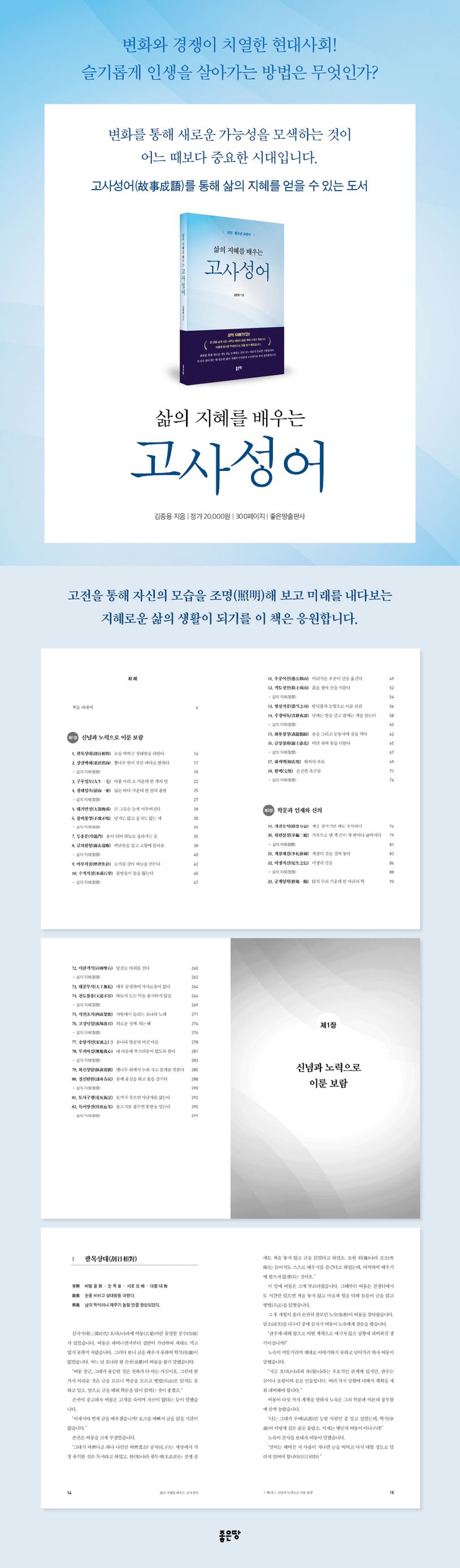 요즈음 우리의 생활은 너무 바쁜 생활을 보내고 있는 것이 현실입니다. 청소년들은 공부에 시달리고, 성인들은 생업을 위해 다른 곳에 마음 쓸 여유가 없습니다. 그래서 우리나라 사람들의 독서량은 매우 적습니다. 하지만 마음의 여유를 가지고 한 번쯤 자신을 돌아보는 시간을 가져 보면 어떨까요. 물이 바위를 만나면 돌아가고, 댐을 만나면 쉬어 가면서 자신의 목적지 바다에 이르듯이, 인생에 있어서도 잠시의 여유로움이 필요합니다. 옛 성현들의 지혜가 담긴 고사성어를 통해 현대를 살아가는 데 필요한 가치 있는 삶의 지혜를 터득하길 바랍니다.