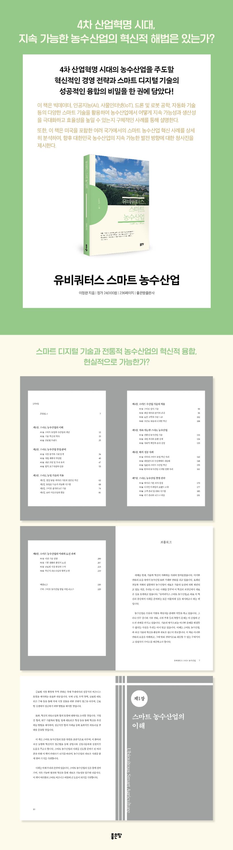 『유비쿼터스 스마트 농수산업』은 새로운 시대의 농수산업을 주도할 혁신적인 경영 전략과 첨단 기술의 통합을 다룬다. 이 책은 빅데이터, 인공지능(AI), 사물인터넷(IoT), 드론 및 로봇 공학, 자동화 기술 등의 다양한 스마트 기술을 활용하여 농수산업에서 어떻게 생산성을 극대화하고 효율성을 높일 수 있는지 구체적인 사례를 통해 설명한다. 또한, 이러한 기술을 실질적으로 적용하기 위한 창업 과정과 경영 전략을 체계적으로 제시하여, 독자들이 실질적인 비즈니스 성공을 달성할 수 있도록 돕는다.