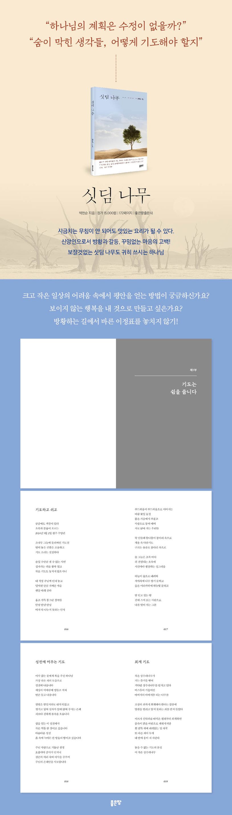 《싯딤 나무》는 시인이 하늘에서 땅으로, 땅에서 하늘로 이어지는 메시지를 독자들과 소통하기 위하여 엮어 낸 시집이다. 시인에게는 보통 사람과 다르게 세상을 보는 감성(感性)이 있다. 세상과 마음을 연결하는 나만의 독특한 언어를 가지고 감성과 대화를 한다. 신앙인으로서 삶에 대한 꾸밈없는 고백이 시집 전체에 가득 펼쳐져 있다. 시인이 믿음의 인생을 살면서 하나님에 대한 마음을 정갈한 시어들로 풀어 내었다. ‘신앙과 삶’에 대한 가치관을 텍스트에 더한 시들을 읽다 보면 독자에게 함께 하나님께로 걸어가는 기분을 준다.