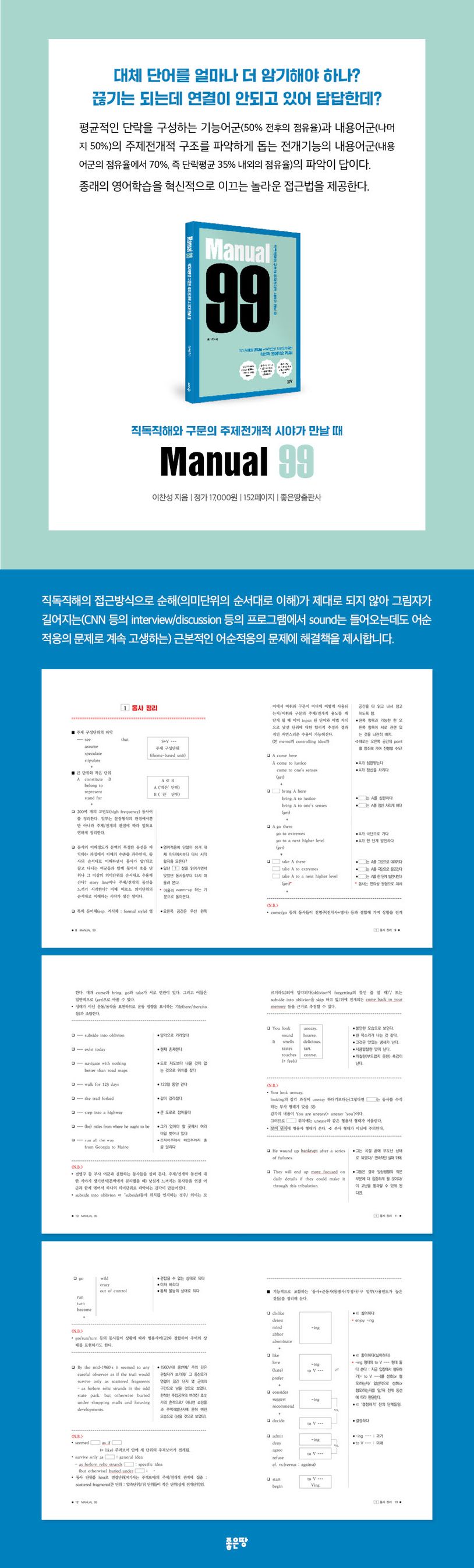 영어 학습에 있어 장문 일부의 첫 의미단위와 연결단위가 직독직해로 연결되지 않는다? 의미 단위 순서대로 가다가 주어/목적어/보어 위치에 오는 명사구문 일부에서 직독직해의 감각이 멈춘다? 이와 같은 문제를 의식하고 있는 적응단계들에게 ‘Manual 99’가 영어 학습의 혁신적 시야를 여는 도구가 되고자 희망한다.
