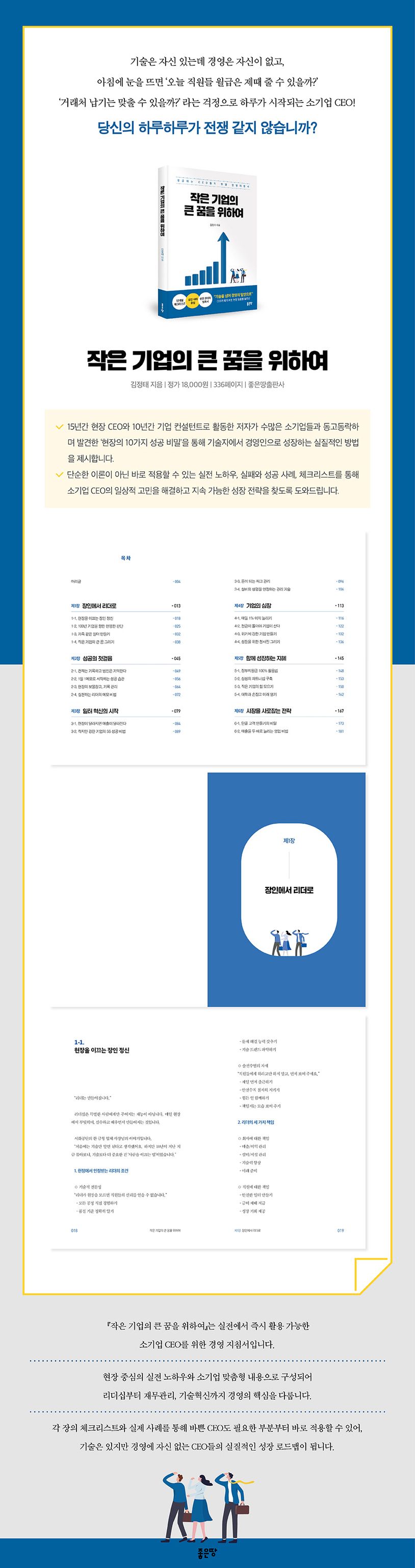 머리글제1장장인에서리더로1-1.현장을이끄는장인정신1-2.100년기업을향한현명한판단1-3.가족같은일터만들기1-4.작은기업의큰꿈그리기제2장성공의첫걸음2-1.천재는기록하고범인은기억한다2-2.1일1메모로시작하는성공습관2-3.현장의보물창고,기록관리2-4.실천하는리더의메모비법제3장일터혁신의시작3-1.현장이달라지면매출이달라진다3-2.작지만강한기업의5S성공비법3-3.돈이되는재고관리3-4.설비의생명을연장하는관리기술제4장기업의심장4-1.매일1%이익늘리기4-2.현금이돌아야기업이산다4-3.위기에강한기업만들기4-4.성장을위한청사진그리기제5장함께성장하는지혜5-1.정부지원금100%활용법5-2.상생의파트너십구축5-3.작은기업의힘모으기5-4.대학과손잡고미래열기제6장시장을사로잡는전략6-1.단골고객만들기의비밀6-2.매출을두배로늘리는영업비법6-3.디지털시대의생존전략6-4.작지만강한브랜드키우기제7장기술의금맥을찾아서7-1.내일의기술을읽는눈7-2.장인기술의진화7-3.기술자산지키기7-4.품질이곧생명이다제8장100년기업을향한도전8-1.변화의파도를타는지혜8-2.스마트공장으로가는길8-3.지속가능한성장동력찾기8-4.가업승계의성공방정식제9장인맥이곧자산이다9-1.평생인맥만들기9-2.신뢰의네트워크구축9-3.마음을얻는대화의기술9-4.신뢰받는기업인의품격제10장작은기업의큰비밀10-1.인재가보물이다10-2.행복한일터의DNA10-3.성과는문화다10-4.열정을키우는동기부여