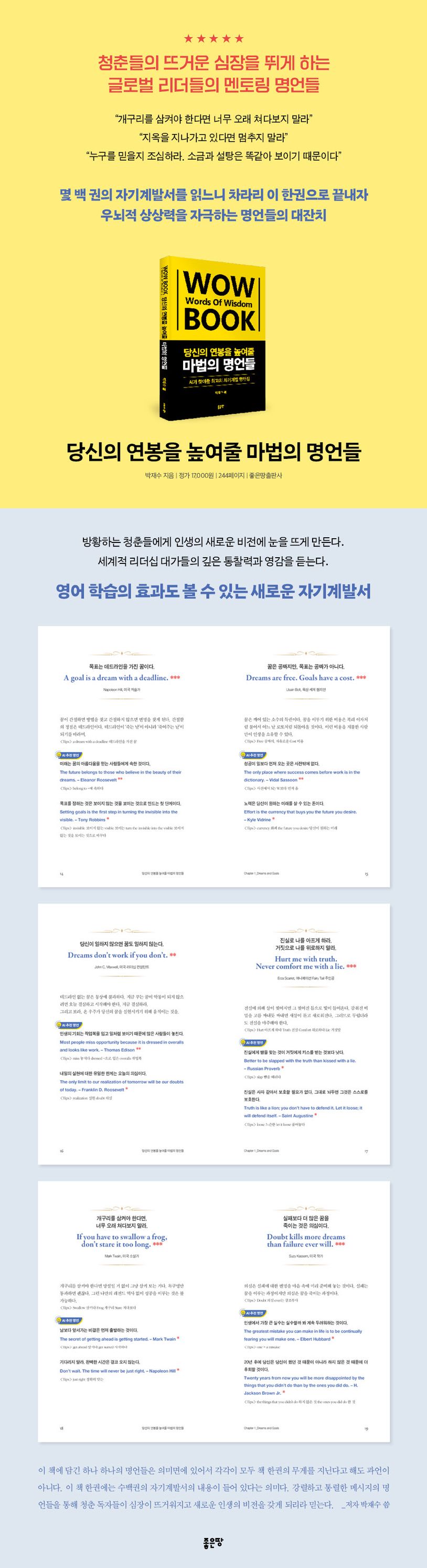 새로운 형태의 자기계발서 - 글로벌 리더들이 말하는 최고의 멘토링 어드바이스를 모은 명언 모읍집. 글로벌 리더들은 이 시대의 젊은이들에게 무엇을 얘기하나. 가슴을 뛰게 만드는 동시대 글로벌 리더들의 놀라운 Words of Wisdom (WoW) 지혜의 말에 귀를 기울여 보자.