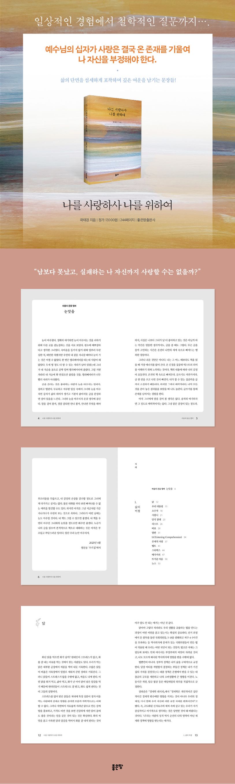 『그러면, 다시 한 번』으로 많은 독자들에게 깊은 울림을 선사했던 곽태경 작가가 두 번째 책 『나를 사랑하사 나를 위하여』를 선보인다. 이번 책은 삶과 신앙, 인간관계, 사회를 바라보는 날카로운 시선과 내면의 깊은 성찰을 담은 에세이집이다. 『나를 사랑하사 나를 위하여』는 개인적인 경험, 사회적 통찰, 철학적 사유, 신앙적 성찰이 어우러져 있다. 책 제목은 성경 갈라디아서 2장 20절에서 따왔으며, 작가가 살아오면서 경험한 다양한 감정과 고민, 세상에 대한 솔직한 시각이 담겨 있다.