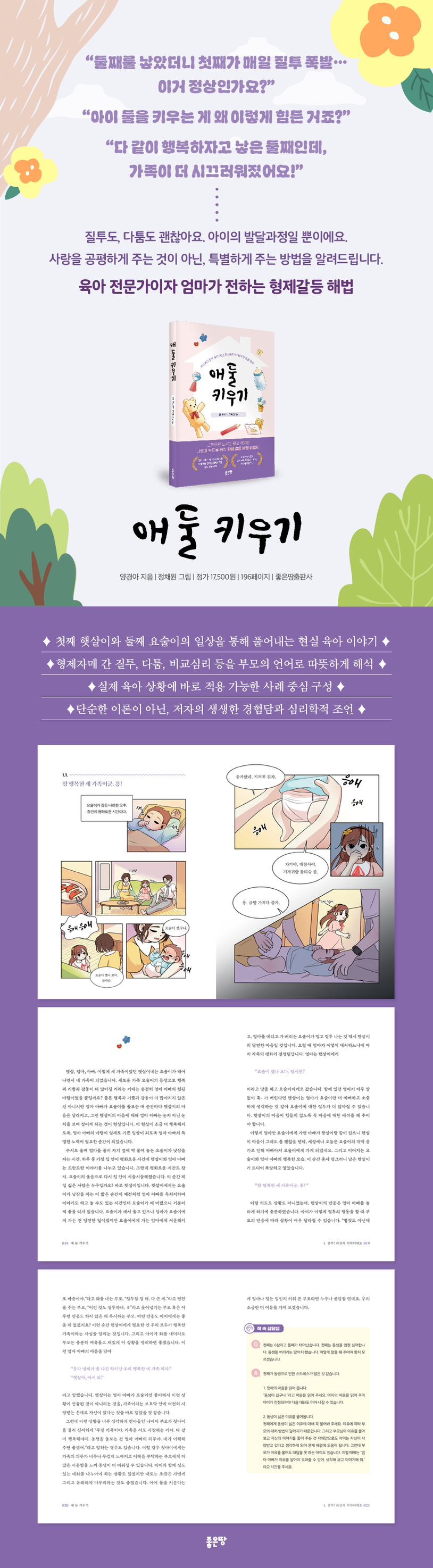 『애 둘 키우기』는 두 아이 사이의 질투와 갈등을 이해하고, 부모로서의 따뜻한 개입을 통해 관계를 회복해 나가는 여정을 담은 현실 육아 에세이입니다. 첫째의 마음을 먼저 살피고, 아이들의 감정을 존중하는 방식으로 접근하는 저자의 이야기는 부모들에게 깊은 공감을 안겨 줍니다. 특별한 기술보다 중요한 것은 아이와의 연결이며, 그 연결을 어떻게 이어갈지에 대한 구체적이고 따뜻한 방법들이 가득합니다. “하나보다 더 힘든 둘”이 아닌 “하나보다 더 행복한 둘”을 위한 부모의 마음이 이 책의 중심에 있습니다. 일상의 소소한 갈등을 통해 가족 간의 사랑을 다시 돌아보게 만드는 이 책은, 아이를 둘 이상 키우는 부모들에게 꼭 필요한 안내서가 될 것입니다.