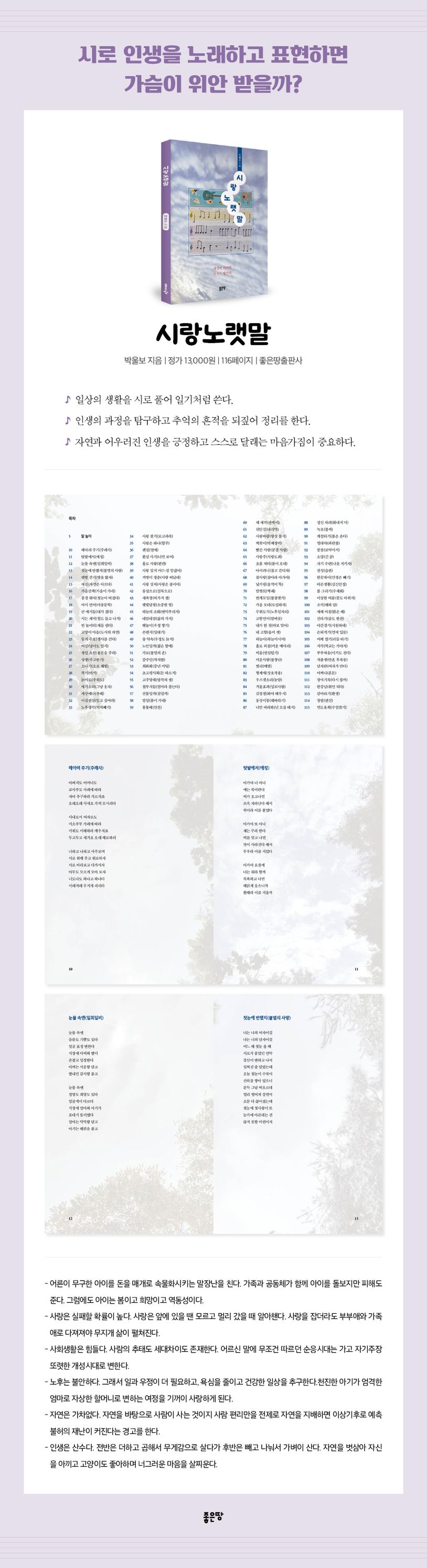 ‘말 놀이’에서 시작해 ‘소망’과 ‘자기 수련’으로 이어지는 총 115편의 시는 우리 마음속 오래된 기억들과 맞닿아 있다. 특히 이 시집은 아이들 말소리와 노인의 걸음, 도시의 고양이와 고향의 언어까지 포착하며 시적 언어로 시대의 숨결을 노래한다.