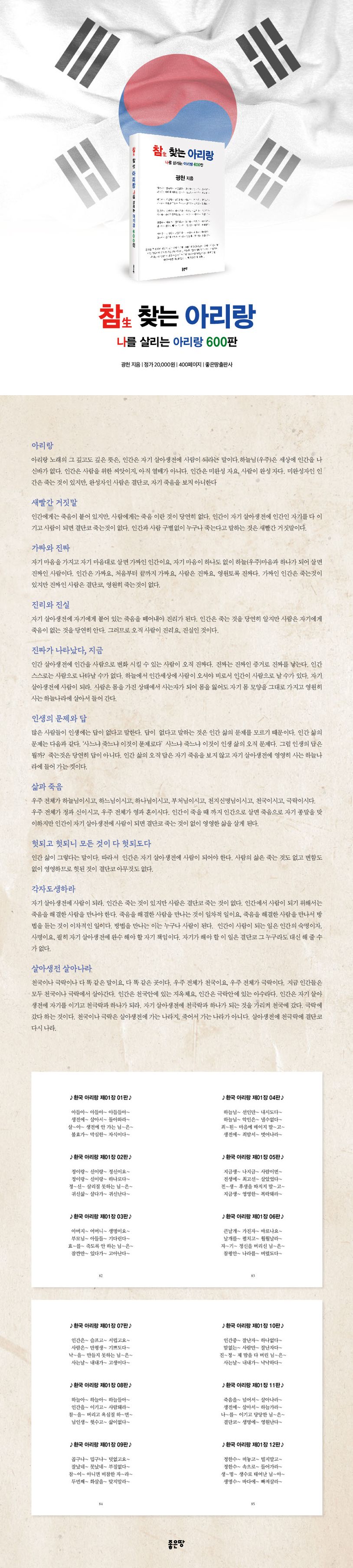 이책은단순히한권의민요집이아니다.‘아리랑’이라는민족정서를품은노랫말을통해천지,생명,우주,사람,신의철학을풀어내며,140억년전만물이전의세상으로우리를안내한다.저자는인류의역사를환국과환인으로부터거슬러올라가며,왜곡된역사와세속문명의허상을꼬집고,진정한인간의길은사람(참신)으로거듭나는것임을강조한다.‘죽는자’가아닌‘사는자’로,영원한생명을가진존재로다시태어나야한다는그의선언은강렬하면서도고요하게마음을울린다.