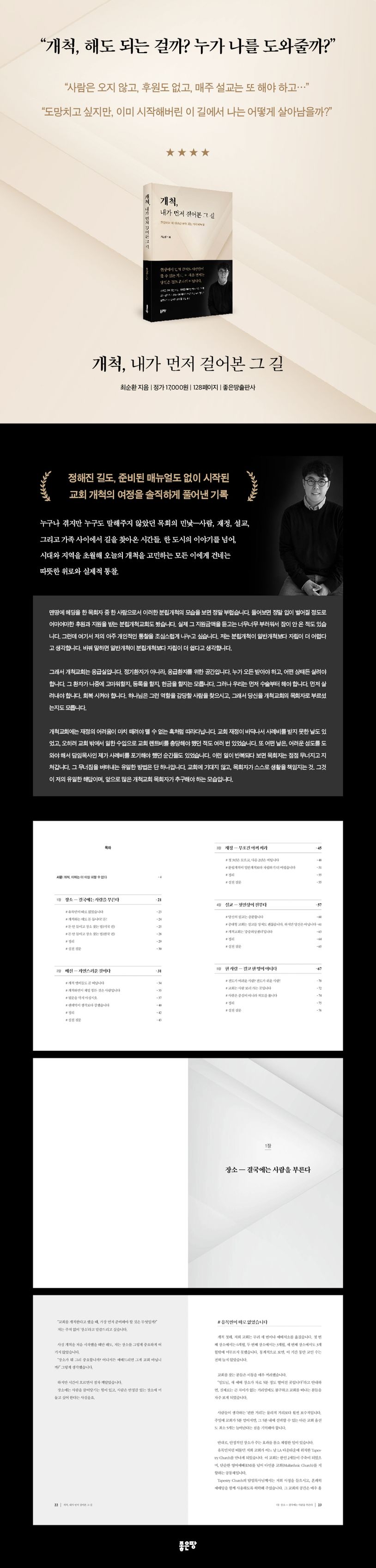 『개척, 내가 먼저 걸어본 그 길』은 미국 LA에서 개척교회를 세운 최순환 목사가 8년간의 생생한 경험을 바탕으로 전하는 현실 밀착형 개척 매뉴얼이다. 막연한 이상이나 이론이 아닌, 장소 선정부터 재정 문제, 성도의 이탈, 팬데믹의 충격까지 실제 현장에서 부딪힌 이야기들이 솔직하고 유쾌하게 펼쳐진다. “교회는 성도를 내보내야 한다”는 저자의 철학은 목회의 본질을 다시 생각하게 한다. 개척을 준비하거나 시작했지만 막막한 이들에게, 이 책은 구체적 지침이자 따뜻한 위로가 된다. 거창한 전략보다 진짜 현장에서 배운 통찰이 필요한 이들을 위한 책이다. 개척이 선택이 아닌 현실이 된 시대, 이 책은 그 길을 먼저 걸어본 이가 전하는 생생한 나침반이다.