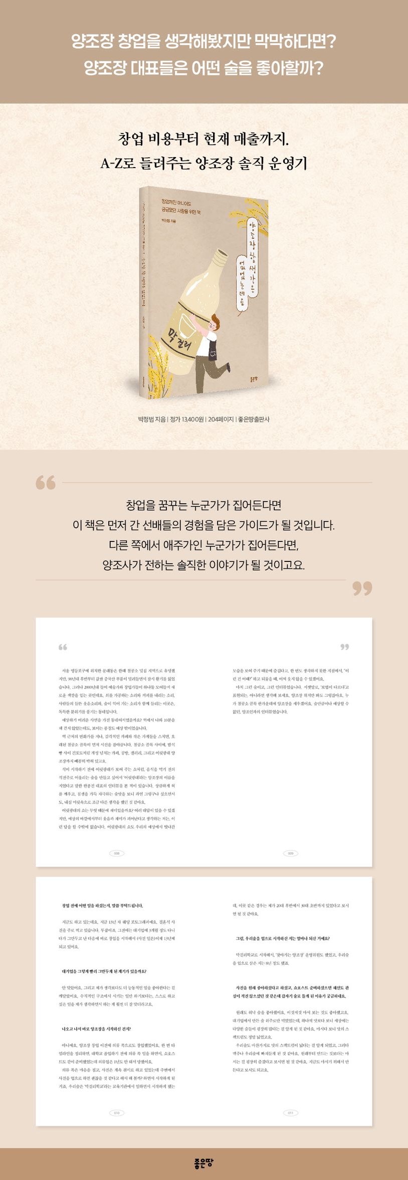 또한 책은 단순히 양조장의 창업 과정이나 경영 현실만을 나열하지 않습니다. 술을 왜 빚게 되었는지, 좋아하는 술의 취향은 무엇인지, 양조업을 하며 겪는 시행착오와 고민, 매출의 어려움, 그리고 업계의 미래에 대한 생각까지 깊이 있게 담아냈습니다. 특히 ‘이 길은 절대 쉽지 않다’는 현실적인 조언과 ‘그럼에도 업계를 위해 새로운 시도는 계속되어야 한다’는 애정 어린 시선이 책 곳곳에 녹아 있어, 단순한 양조 창업기가 아닌, 술과 사람, 그리고 삶의 이야기로 읽힐 것입니다.