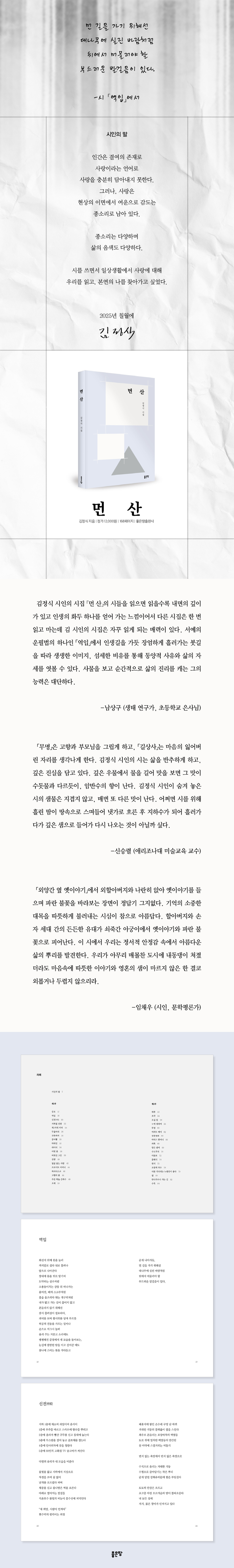 시집 『먼 산』은 일상 속 풍경과 사람들, 그리고 잊힌 기억과 감정을 시인의 섬세한 시선으로 길어 올린다. 도시의 소음, 붕어빵 장수의 삶, 어머니의 병상, 외할아버지의 옛이야기 등 작고 사소한 장면들이 시를 통해 따뜻한 여운으로 살아난다. 시인은 삶을 정면으로 마주하기보다 ‘먼 산’처럼 한 걸음 물러서 바라보며, 그 틈에서 깊은 울림을 전한다. 삶의 무게를 짊어진 이들에게 위로를 건네며, 시는 어느새 독자의 마음을 조용히 감싸 안는다. 담백하면서도 밀도 있는 언어는 우리 안의 풍경을 다독이고, 묵직한 감정의 결을 드러낸다. 이 시집은 느리고 깊은 호흡으로 삶을 바라보게 하는 아름다운 시적 체험이다.