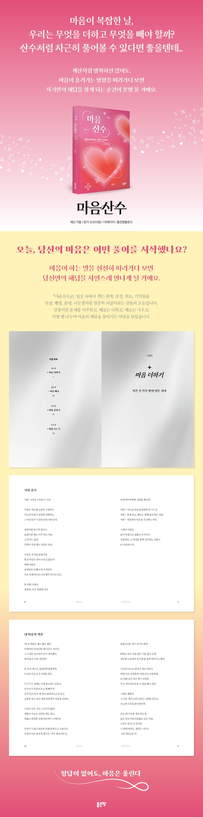 『마음산수』는마음의풍경을덧셈,뺄셈,곱셈,나눗셈이라는네가지수학적기호로풀어낸작품이다.마음에는정답이없지만,우리는매일더하고빼고,곱하고나누며살아간다.사랑하는사람과의만남은곱셈이되어마음을배가시키고,이별은나눗셈처럼마음을쪼개어텅빈자리를남긴다.작은기쁨은덧셈처럼쌓이고,아픈기억은뺄셈처럼우리를비워낸다.이책은그러한‘마음의산수’를따라가며,정답보다과정속에서피어나는감정의의미를발견하게한다.저자는『마음한조각』에서흩어진감정을모아냈다면,이번책에서는그것을차분히셈하며더깊이들여다본다.『마음산수』에담긴글들은때로는시처럼간결하고,때로는일기처럼따뜻하다.마음이쌓여사랑으로자라는과정을수식처럼풀어내기도하고,흔들리는마음의불안과성장의과정을담담하게기록하기도하였다.이책은단순한위로나감정의토로에머물지않는다.곱셈처럼커지는우정,나눗셈처럼나누어야더커지는마음,빼기를통해서만보이는그림자와빈자리까지세심히포착한다.독자는이책을통해자기안의감정을정직하게마주하고,때로는계산이서지않는마음의미지수와도화해할수있을것이다.『마음산수』는우리각자가살아가는매일의‘마음수업’에다정한길잡이가되어줄것이다.정답을찾지않아도괜찮다고,중요한것은문제를함께풀어가는과정이며,마음을셈하는시간이결국자기자신을알아가는시간이자더깊은사랑과이해로나아가는길임을조용히일깨워줄것이다.