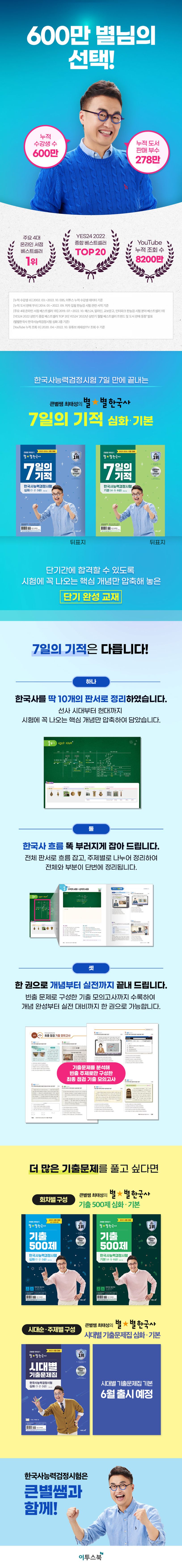 7일 만에 한능검 합격 점수를 획득할 수 있도록 시험에 꼭 나오는 핵심 내용만을 압축하여 담았습니다. 20년 넘게 판서를 연구해 온 판서의 장인 큰별쌤이 핵심만을 모아 만들어낸 10개의 아트 판서를 수록하였고, 시험에 자주 나오는 기출 자료와 대표 기출문제를 선별하여 수록하였습니다. 시험에 종종 출제되는 세시 풍속, 유네스코와 유산, 지역사, 문화재, 근현대 인물을 기출문제와 함께 정리하였습니다. 실전 감각을 익힐 수 있도록 빈출 주제를 선별하여 최종 점검 기출 모의고사 2회분을 구성하였습니다.