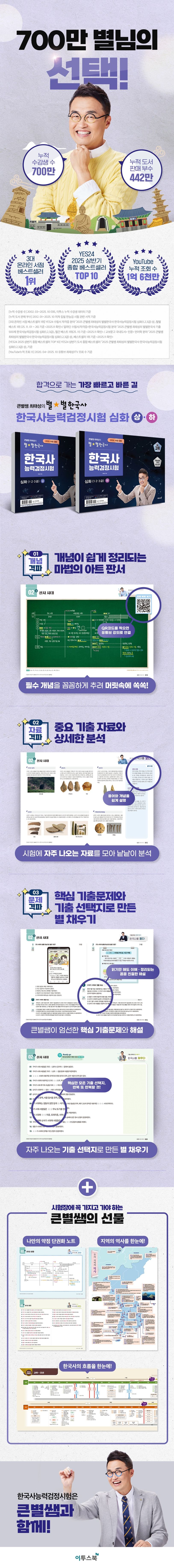 오랜 연구와 검증으로 한국사에 기초가 전혀 없는 사람도 단기간에 한능검에 합격할 수 있는 최적의 구성을 완성하였습니다. 판서의 장인 큰별쌤 최태성이 핵심만을 모아 만든 아트 판서를 수록하고, 시험에 자주 등장하는 사료, 사진, 지도 등을 모아 해설하여 합격을 위한 필수 개념을 익히기 쉽게 하였습니다. 또한, 한능검 기출문제를 모두 분석한 후, 기출 선택지를 이용한 별 채우기 문제를 수록하여 자연스럽게 기출 선택지가 기억될 수 있도록 하였고, 반복적으로 출제되는 주제의 최신 기출문제를 꼼꼼하고 친절한 해설과 함께 담아 실전에 대비할 수 있도록 하였습니다. 여기에 한국사 연표와 지역의 역사를 담은 지도를 통해 한국사 흐름잡기가 더욱 쉬울 것입니다.