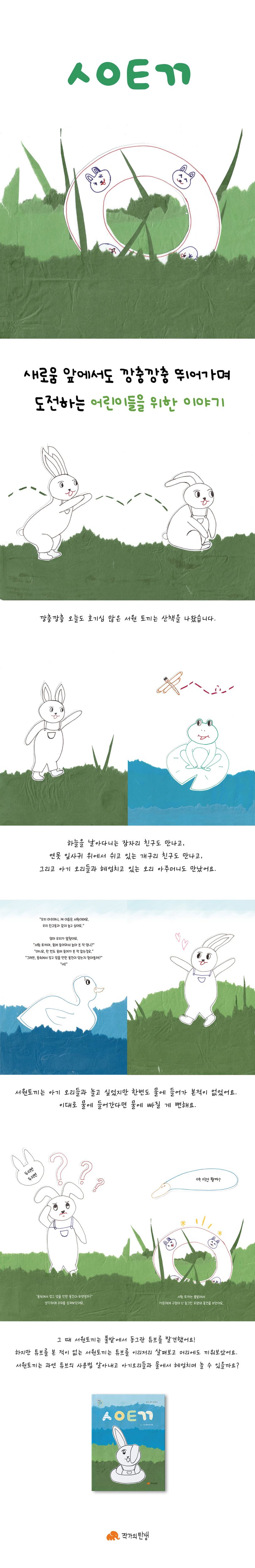 깡충깡충 오늘도 호기심 많은 서원 토끼는 산책을 나왔습니다. 하늘을 날아다니는 잠자리 친구도 만나고, 연못 잎사귀 위에서 쉬고 있는 개구리 친구도 만나고, 그리고 아기 오리들과 헤엄치고 있는 오리 아주머니도 만났어요.