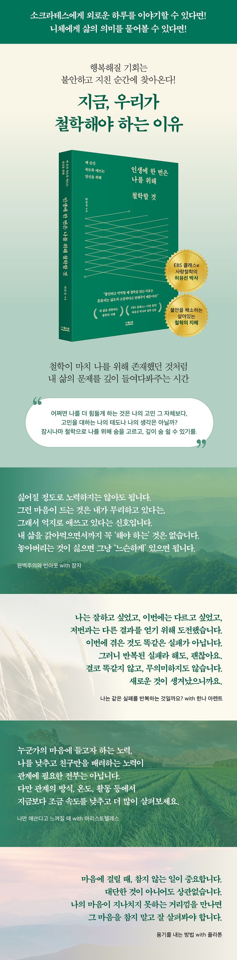 《인생에 한 번은 나를 위해 철학할 것》에서 18명의 철학자들은 삶의 물음에 대해 이렇게 정교하게 질문하고 답해준다. 니체가 기존의 질서를 파괴하는 방식이었다면, 소크라테스는 묻고 또 묻는 방식으로, 칸트는 규칙과 잣대를 이용하는 방식으로 각자의 입장에서 살아있는 지혜를 건네준다. 어떻게든 삶의 힌트를 알려주는 철학, 우리가 철학하지 않을 이유가 없다.