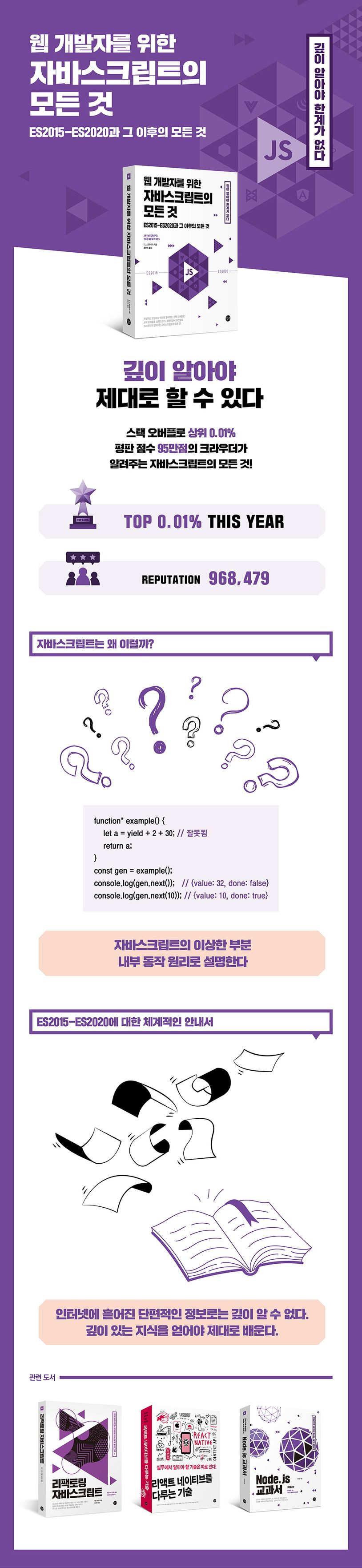 자바스크립트를 사용하다가 막히는 부분이 있다면 인터넷 어딘가에 숨어 있는 정보를 찾아서 해결할 수도 있다. 그러나 폭넓은 설명과 깊이, 내가 무엇을 모르는지도 모르는 것을 알게 해줄 풍부한 지침서를 찾는다면 이 책이라고 할 수 있다. 깊이 알면 내가 더 깊어진다.