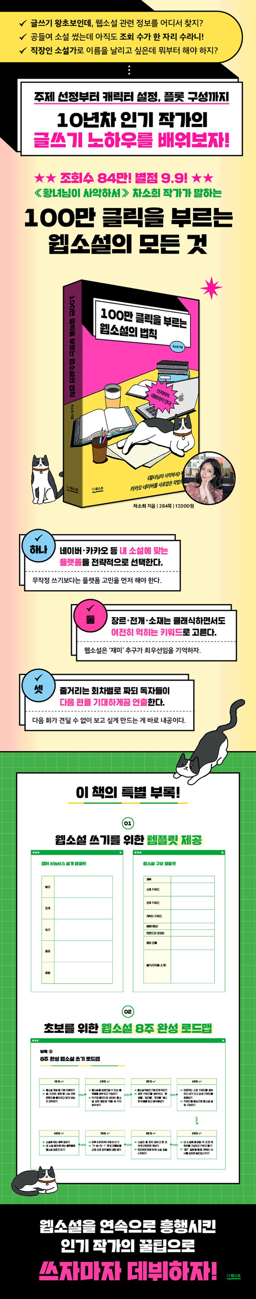《황녀님이 사악하셔》를 비롯해 카카오페이지, 네이버에 다수의 웹소설을 연재하며 억대 수익을 올리고 있는 차소희 작가가 ‘100만 클릭을 부르는 웹소설’의 비밀을 본격 파헤친다. 철저히 독자의 ‘리딩 니즈(reading needs)’를 따지고, 클래식하면서도 여전히 인기 있는 키워드를 골라 기획하며, 캐릭터에 입체감을 부여하고, 웹소설 특유의 극적 연출을 넣어 플롯을 짜는 방법을 알려준다. 직장인이었으나 현재는 최고의 웹소설 작가로 손꼽히는 차소희 작가만의 작법 노하우를 이제 배워보자.